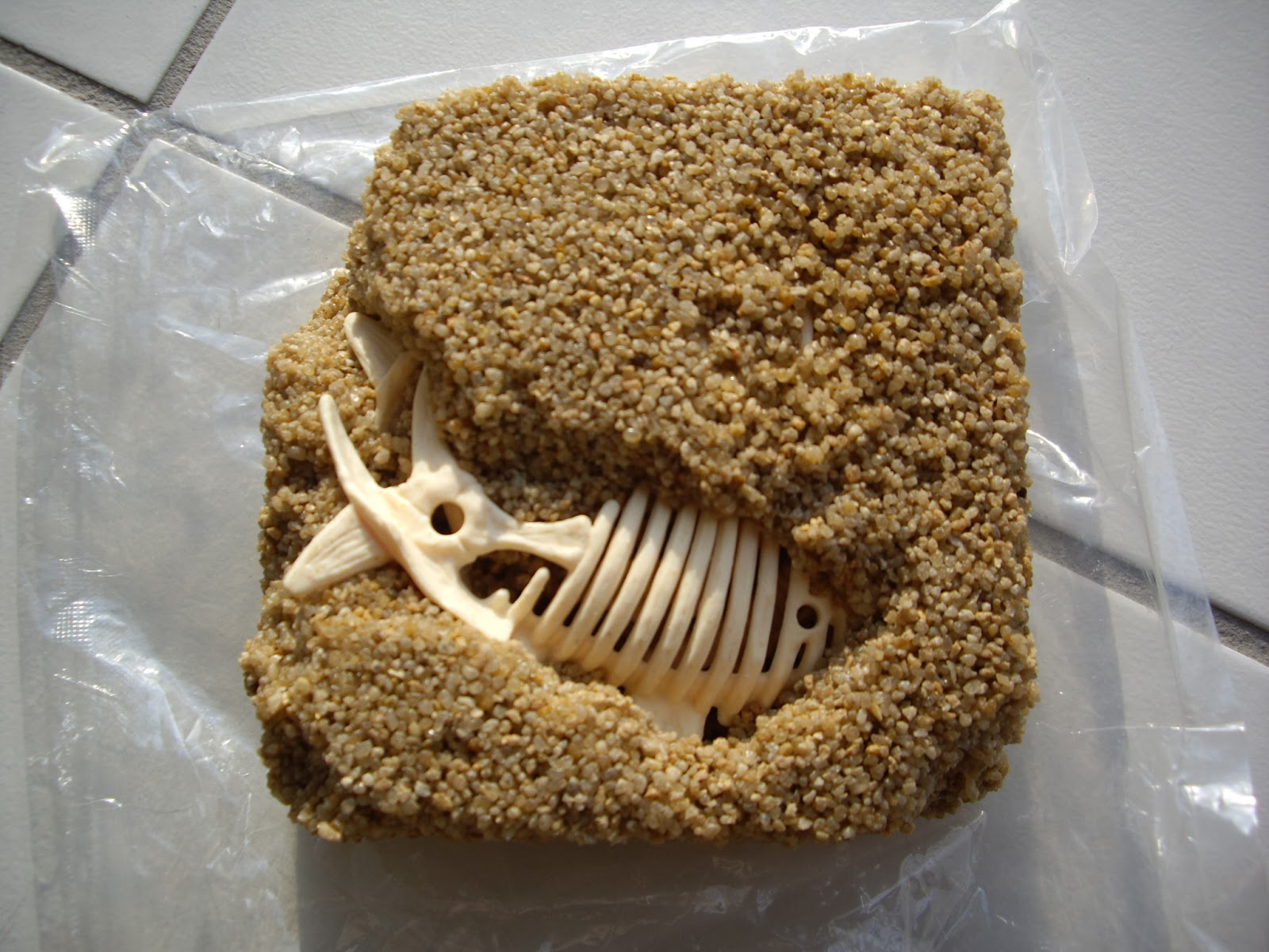 After many hours of digging around, my wife finally got the dinosaur out. I definitely don't recommend doing all the hammering and digging inside the house unless you have it in a container and cover your work area well. It gets kind of messy!