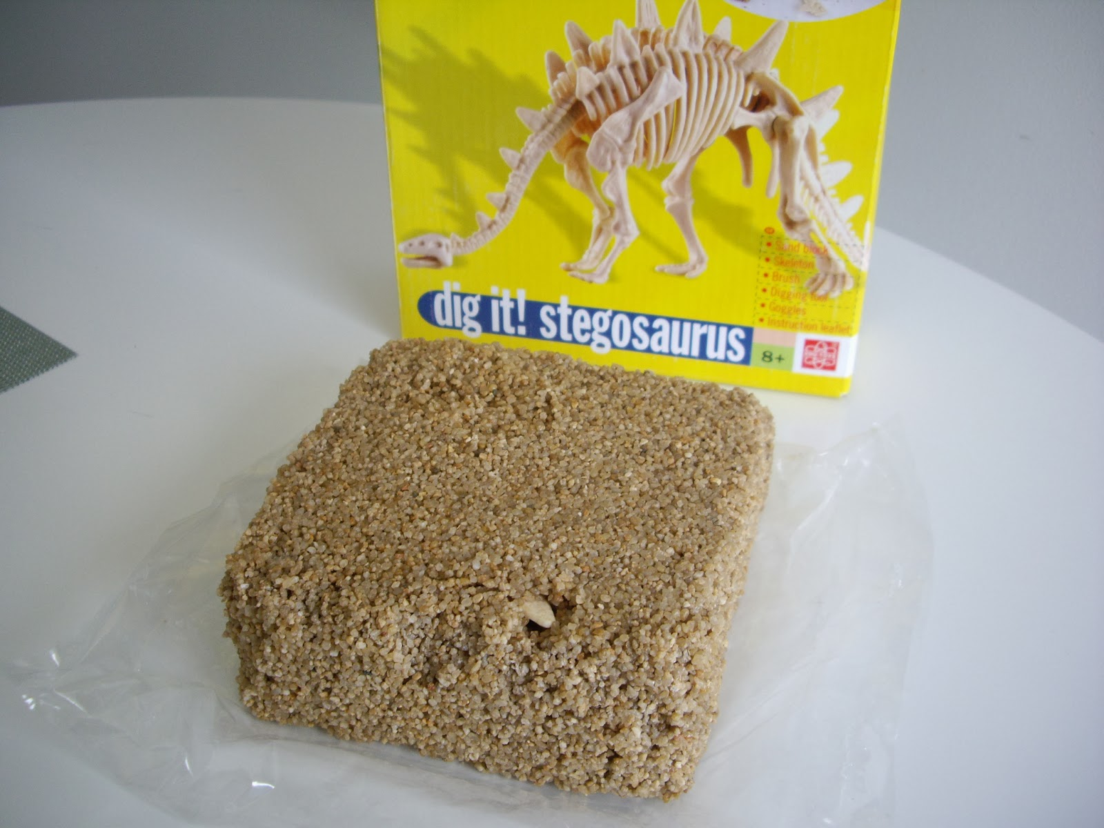 After many hours of digging around, my wife finally got the dinosaur out. I definitely don't recommend doing all the hammering and digging inside the house unless you have it in a container and cover your work area well. It gets kind of messy!